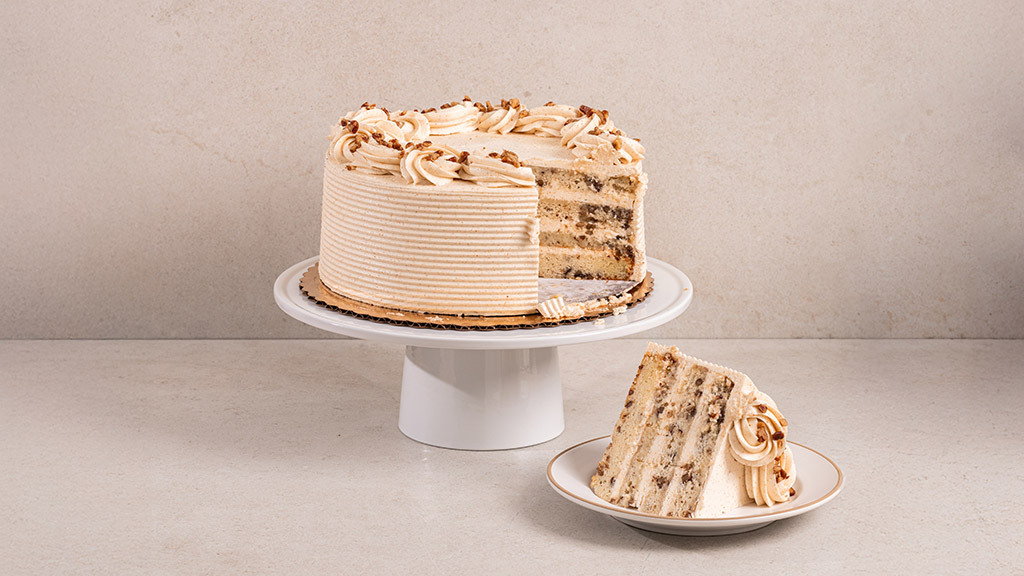 Our Toffee Pecan Cake is the ultimate seasonal indulgence. Rich layers of buttery cake filled with crunchy pecans, a drizzle of toffee, and a touch of creaminess in every bite. It’s decadent without being overly sweet and pairs beautifully with coffee or tea.