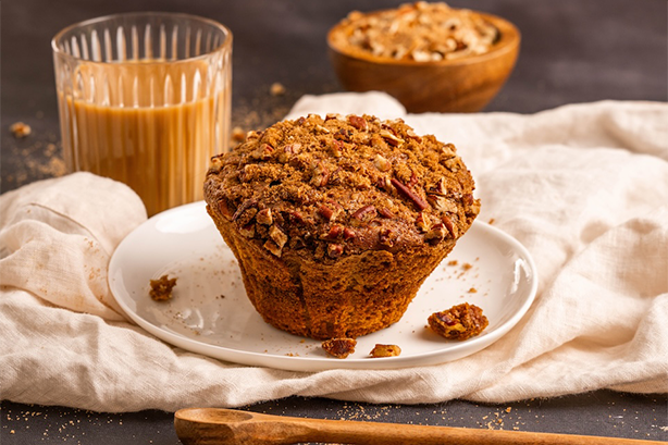Spiced pumpkin muffin with cream cheese filling; topped with brown sugar and pecans